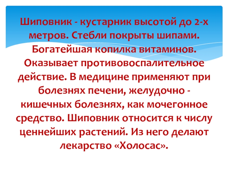 копилка витаминов. Оказывает противовоспалительное действие. В медицине применяют при болезнях печени, желудочно - кишечных болезнях, как мочегонное средство. Шиповник относится к числу ценнейших растений. Из него делают лекарство «Холосас».