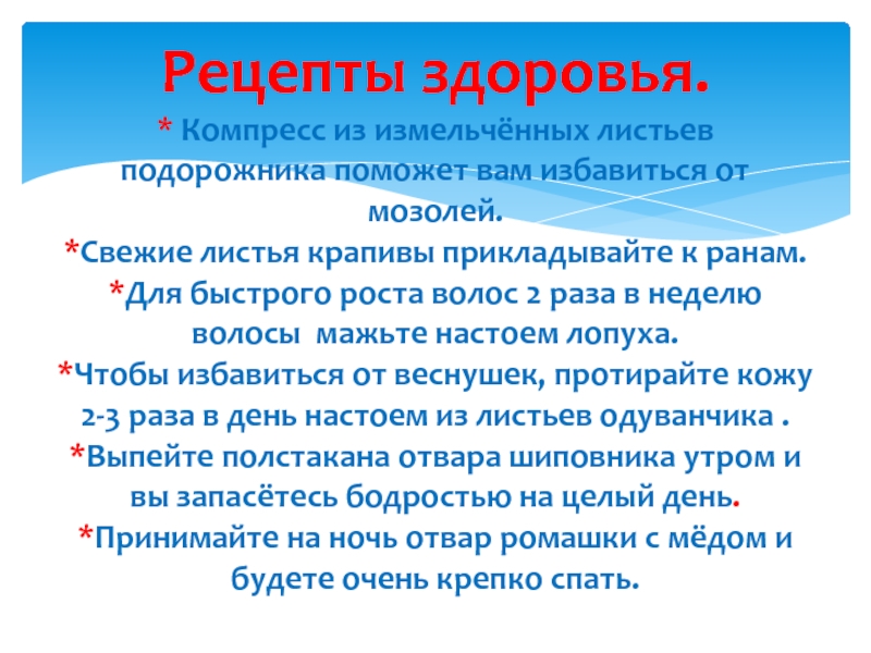 Пусть каждый день вам приносит радость . А чтобы вы не болели, мы хотим подарить вам рецепты здоровья.
