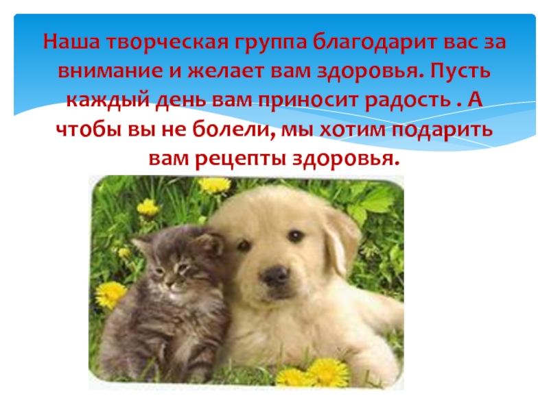 Слайд 24Наша творческая группа благодарит вас за внимание и желает вам здоровья.