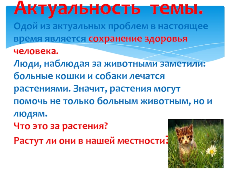 Люди, наблюдая за животными заметили: больные кошки и собаки лечатся растениями. Значит, растения могут помочь не только больным животным, но и людям.