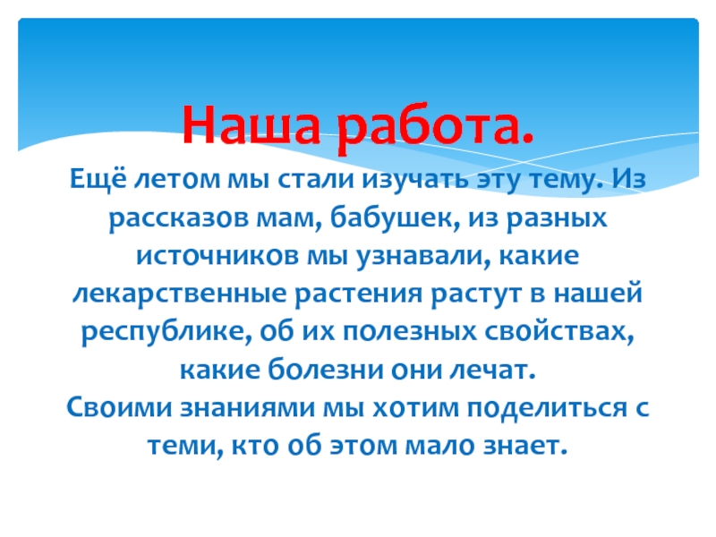 мам, бабушек, из разных источников мы узнавали, какие лекарственные растения растут в нашей республике, об их полезных свойствах, какие болезни они лечат.