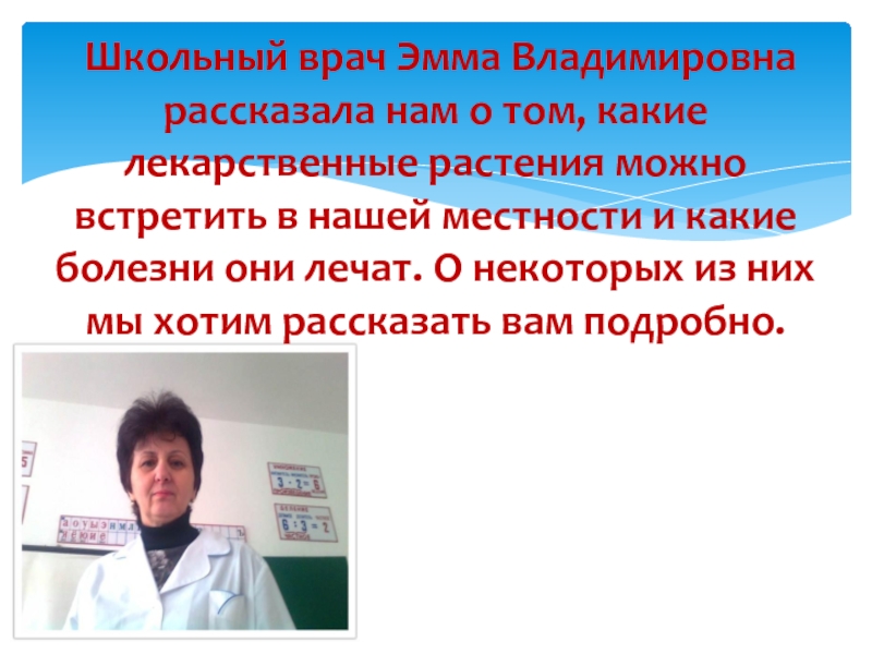 Слайд 7 Школьный врач Эмма Владимировна рассказала нам о том, какие лекарственные