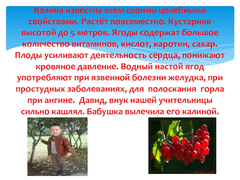 5 метров. Ягоды содержат большое количество витаминов, кислот, каротин, сахар. Плоды усиливают деятельность сердца, понижают кровяное давление. Водный настой ягод употребляют при язвенной болезни желудка, при простудных заболеваниях, для полоскания горла при ангине. Давид, внук нашей учительницы сильно кашлял. Бабушка вылечила его калиной.