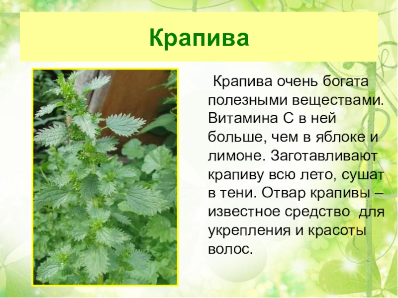 в яблоке и лимоне. Заготавливают крапиву всю лето, сушат в тени. Отвар крапивы – известное средство для укрепления и красоты волос.