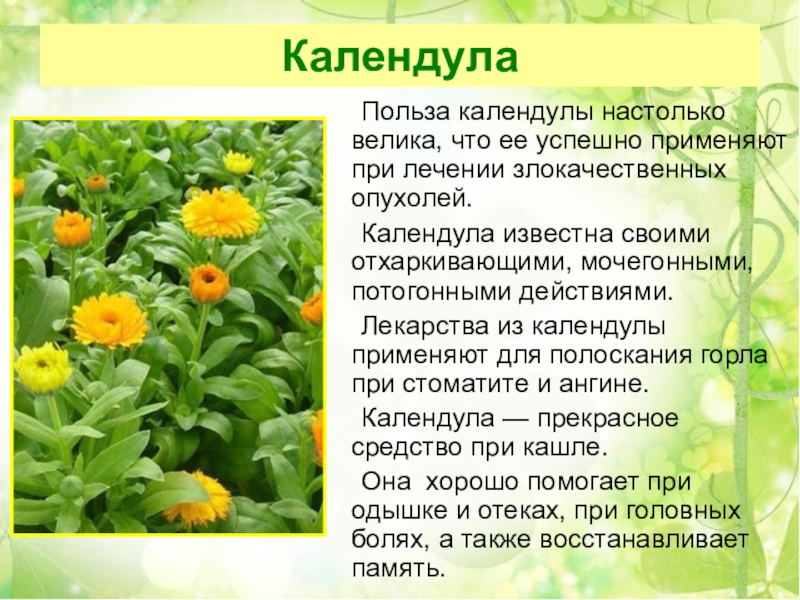 Календула известна своими отхаркивающими, мочегонными, потогонными действиями.