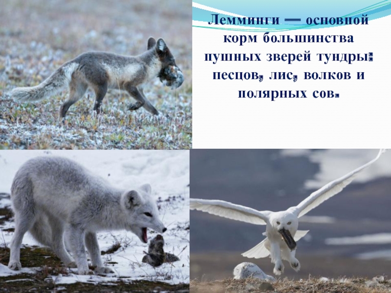 Слайд 7Лемминги — основной корм большинства пушных зверей тундры: песцов, лис, волков