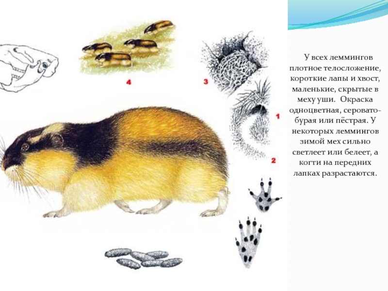 Слайд 4 У всех леммингов плотное телосложение, короткие лапы и хвост, маленькие,
