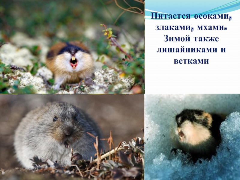 Слайд 3Питается осоками, злаками, мхами. Зимой также лишайниками и ветками