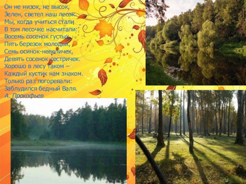 Слайд 6Он не низок, не высок, Зелен, светел наш лесок. Мы, когда учиться стали В