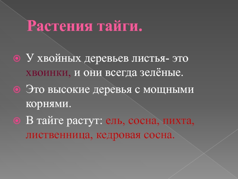 Растения тайги.У хвойных деревьев листья- это хвоинки, и они всегда зелёные.Это высокие деревья с мощными корнями.В тайге