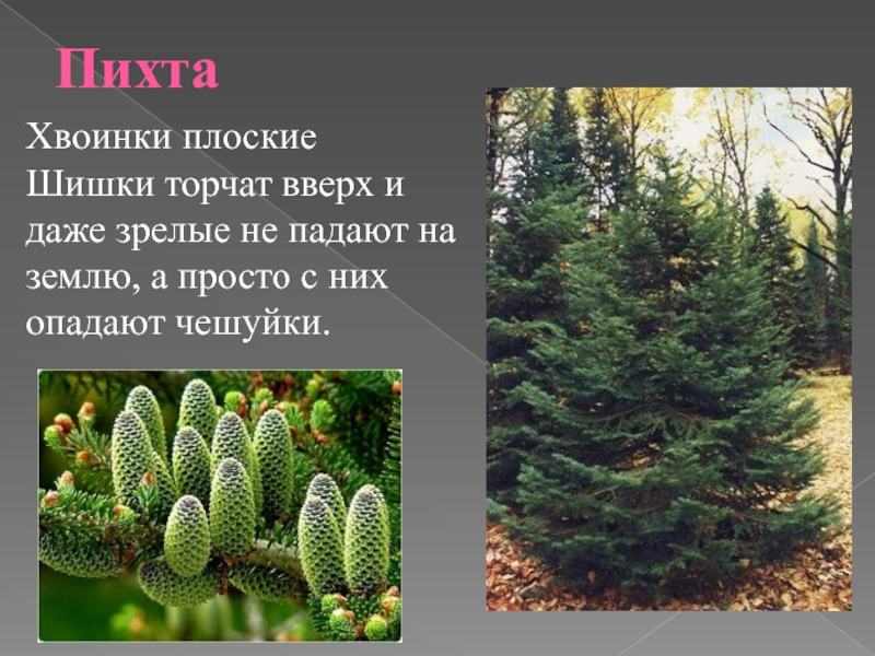 ПихтаХвоинки плоскиеШишки торчат вверх и даже зрелые не падают наземлю, а просто с нихопадают чешуйки.