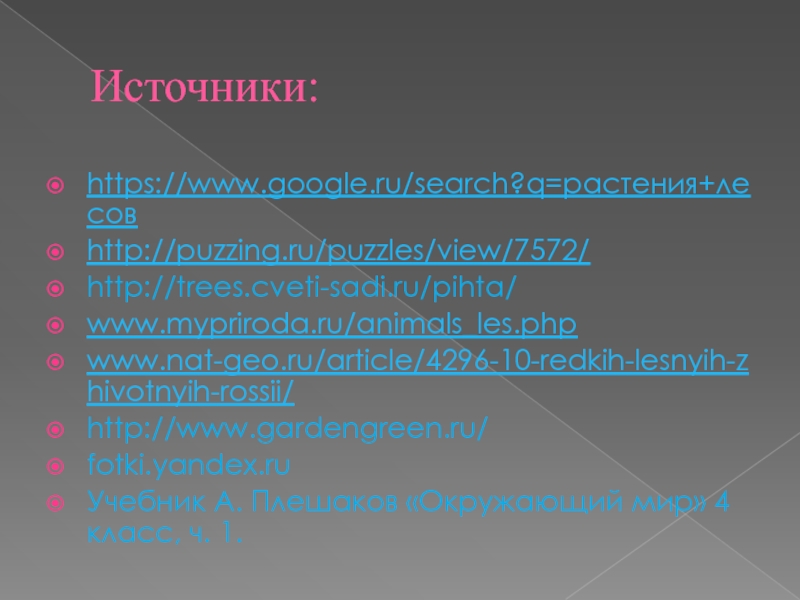 Источники:https://www.google.ru/search?q=растения+лесовhttp://puzzing.ru/puzzles/view/7572/http://trees.cveti-sadi.ru/pihta/www.mypriroda.ru/animals_les.phpwww.nat-geo.ru/article/4296-10-redkih-lesnyih-zhivotnyih-rossii/http://www.gardengreen.ru/fotki.yandex.ru Учебник А. Плешаков «Окружающий мир» 4 класс, ч. 1.