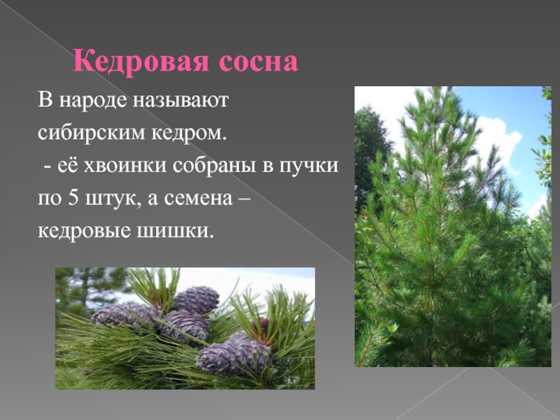 Кедровая соснаВ народе называют сибирским кедром. - её хвоинки собраны в пучкипо 5 штук, а семена