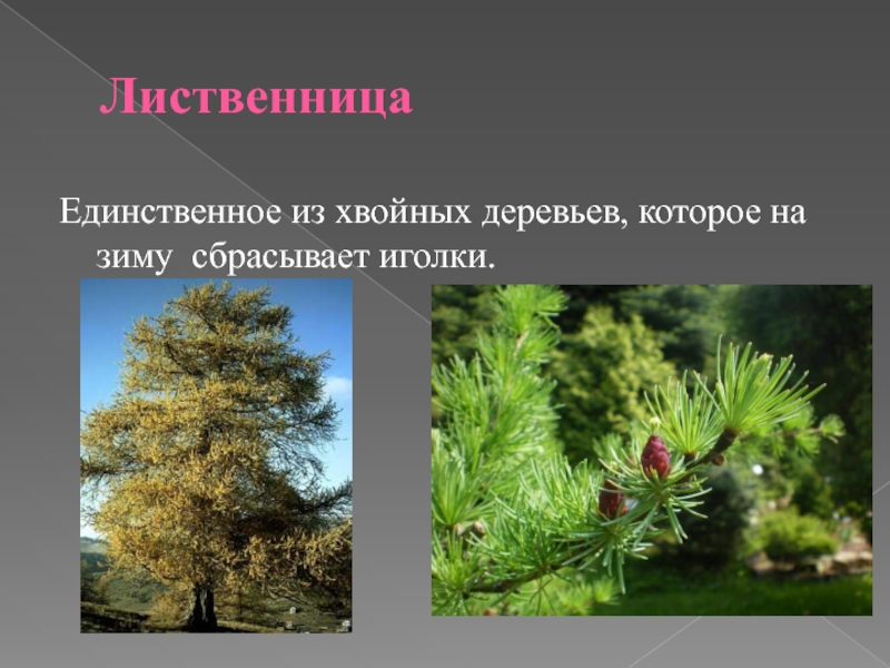 ЛиственницаЕдинственное из хвойных деревьев, которое на зиму сбрасывает иголки.