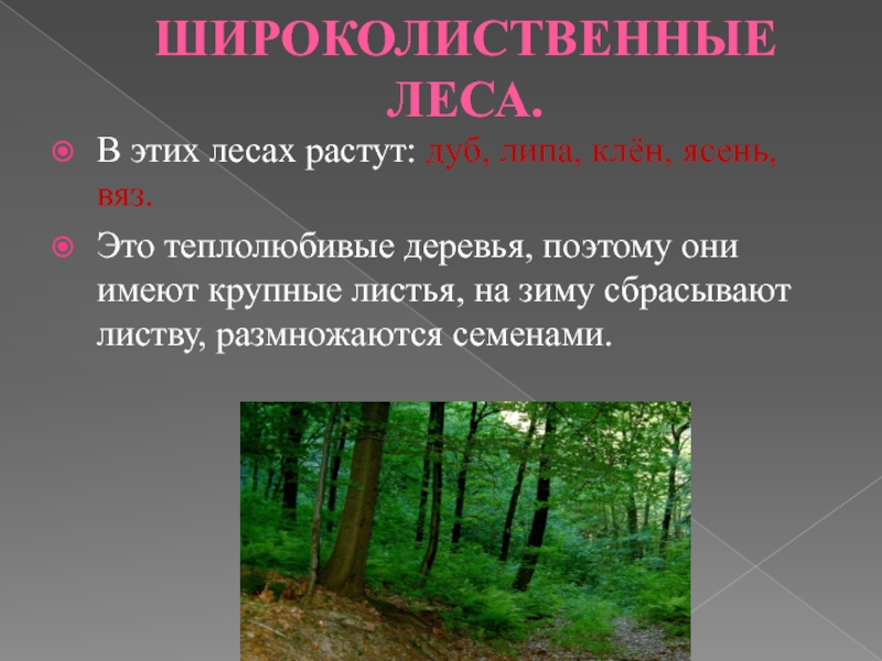 ШИРОКОЛИСТВЕННЫЕ ЛЕСА.В этих лесах растут: дуб, липа, клён, ясень, вяз.Это теплолюбивые деревья, поэтому они имеют крупные листья,