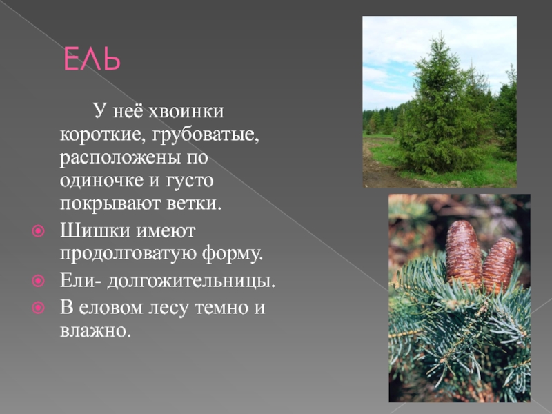ЕЛЬУ неё хвоинки короткие, грубоватые, расположены по одиночке и густо покрывают ветки.Шишки имеют продолговатую форму.Ели- долгожительницы.В еловом