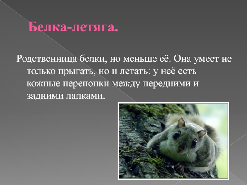 Белка-летяга.Родственница белки, но меньше её. Она умеет не только прыгать, но и летать: у неё есть кожные