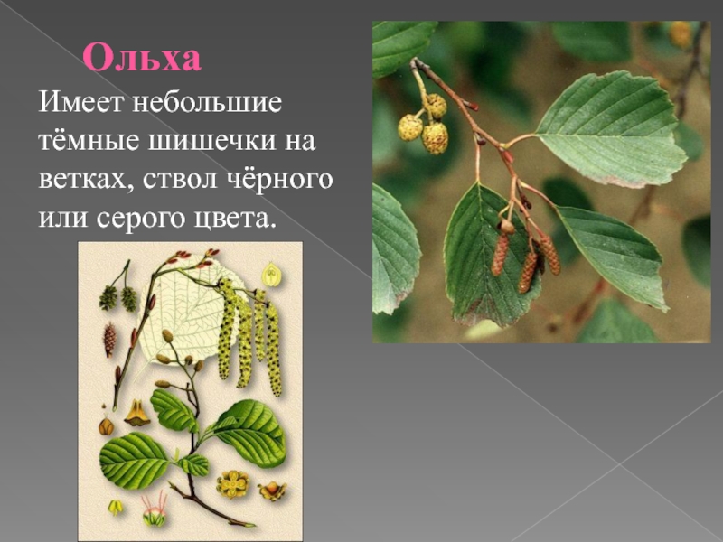 ОльхаИмеет небольшие тёмные шишечки на ветках, ствол чёрного или серого цвета.