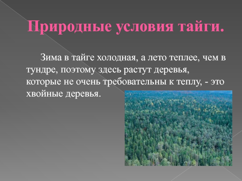 Природные условия тайги.Зима в тайге холодная, а лето теплее, чем в тундре, поэтому здесь растут деревья, которые