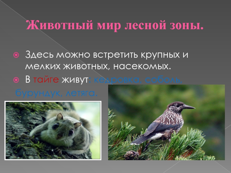 Животный мир лесной зоны.Здесь можно встретить крупных и мелких животных, насекомых.В тайге живут: кедровка, соболь,бурундук, летяга.