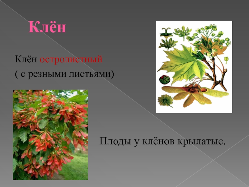 КлёнКлён остролистный( с резными листьями)Плоды у клёнов крылатые.