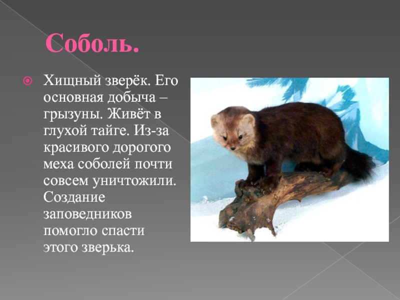 Соболь.Хищный зверёк. Его основная добыча – грызуны. Живёт в глухой тайге. Из-за красивого дорогого меха соболей почти