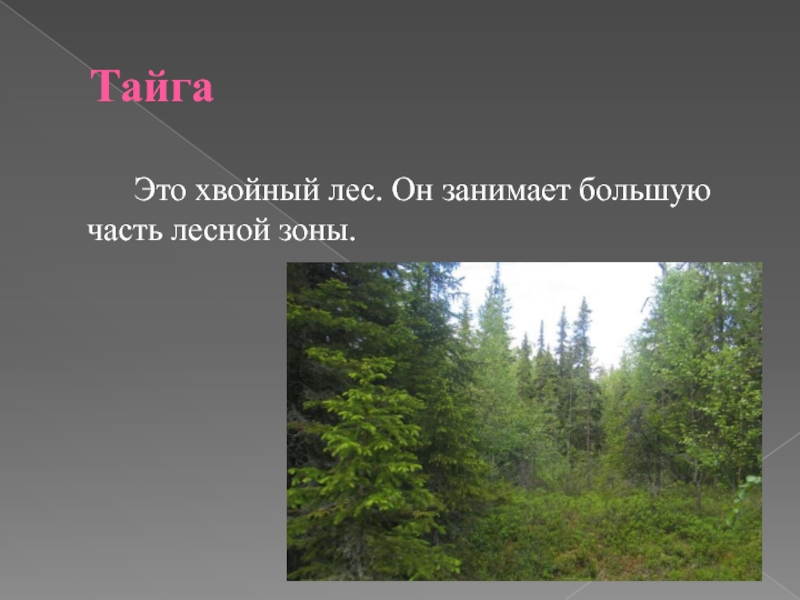 ТайгаЭто хвойный лес. Он занимает большую часть лесной зоны.
