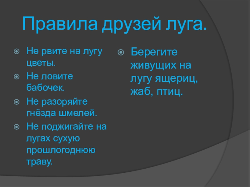 Правила друзей луга.Берегите живущих на лугу ящериц, жаб, птиц.Не рвите на лугу цветы.Не ловите бабочек.Не разоряйте гнёзда