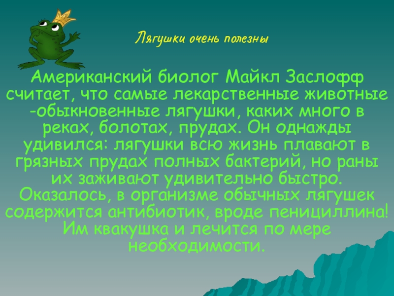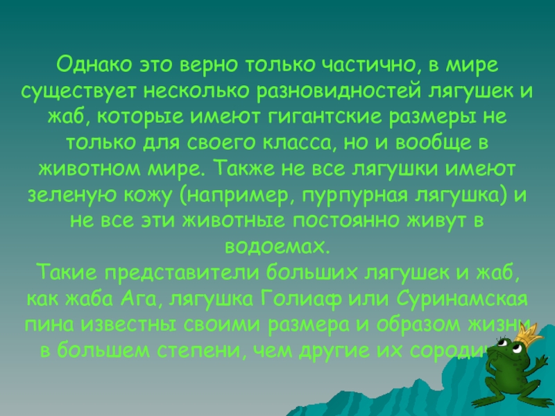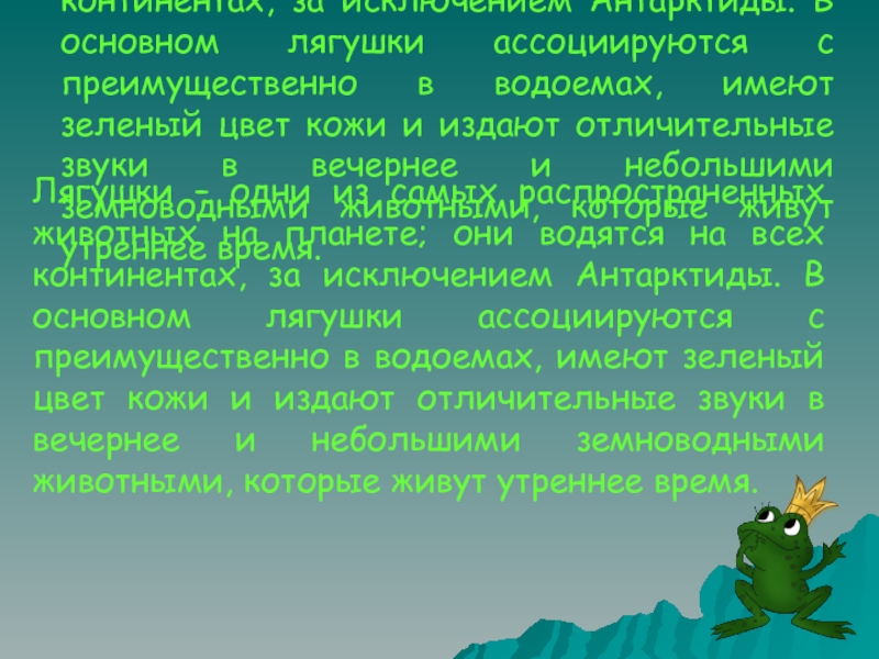 Лягушки – одни из самых распространенных животных на планете; они водятся на всех континентах, за исключением Антарктиды. В основном лягушки ассоциируются с преимущественно в водоемах, имеют зеленый цвет кожи и издают отличительные звуки в вечернее и небольшими земноводными животными, которые живут утреннее время.