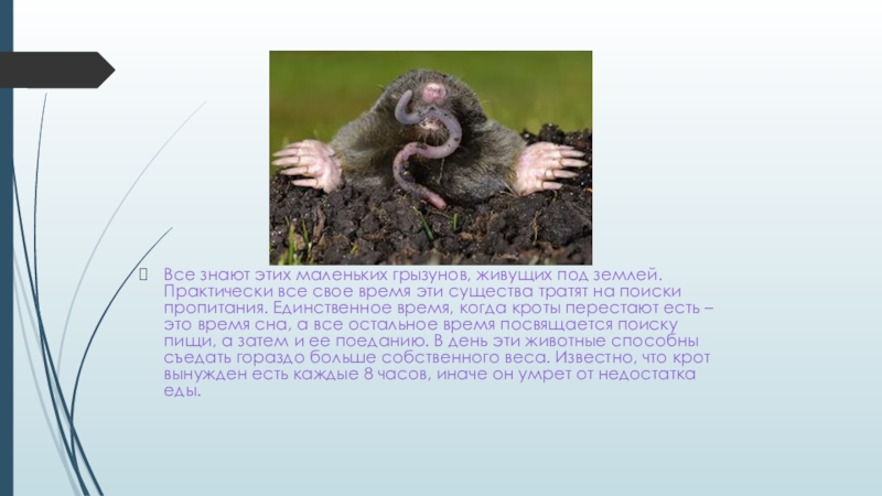 время эти существа тратят на поиски пропитания. Единственное время, когда кроты перестают есть – это время сна, а все остальное время посвящается поиску пищи, а затем и ее поеданию. В день эти животные способны съедать гораздо больше собственного веса. Известно, что крот вынужден есть каждые 8 часов, иначе он умрет от недостатка еды.