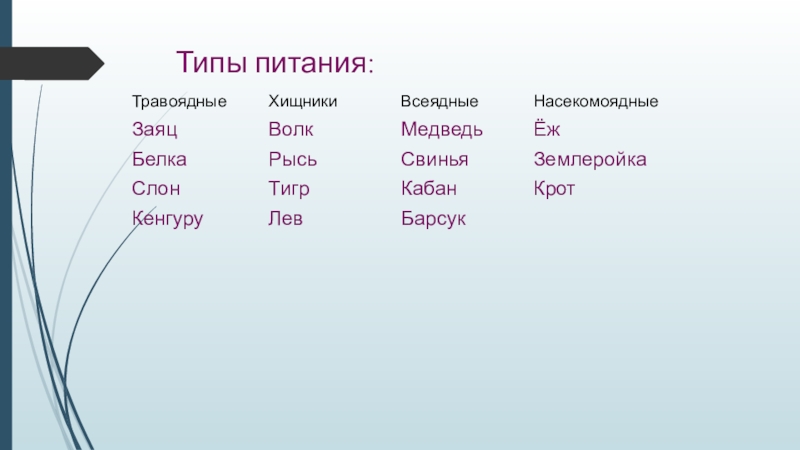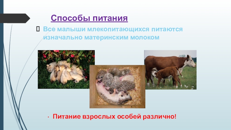 Способы питанияВсе малыши млекопитающихся питаются изначально материнским молокомПитание взрослых особей различно!