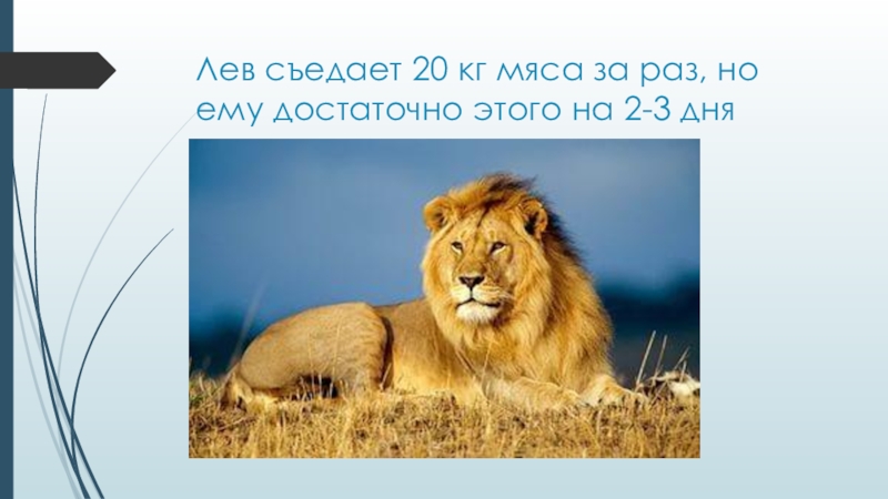 Слайд 11Лев съедает 20 кг мяса за раз, но ему достаточно этого