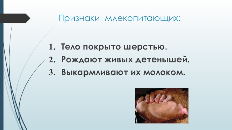 Признаки млекопитающих:Тело покрыто шерстью.Рождают живых детенышей.Выкармливают их молоком.
