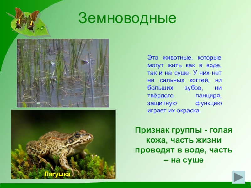 Это животные, которые могут жить как в воде, так и на суше. У них нет ни сильных когтей, ни больших зубов, ни твёрдого панциря, защитную функцию играет их окраска.
