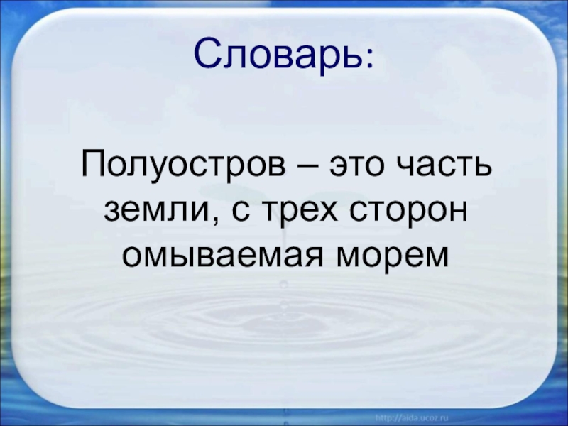 Словарь:Полуостров – это часть земли, с трех сторон омываемая морем