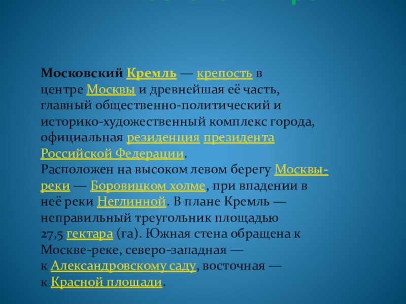 Московский кремль Московский Кремль — крепость в центре Москвы и древнейшая её часть, главный общественно-политический и историко-художественный комплекс города, официальная резиденция президента Российской Федерации.Расположен на высоком левом берегу Москвы-реки — Боровицком холме, при впадении в неё реки Неглинной. В плане Кремль — неправильный треугольник площадью 27,5 гектара (га). Южная стена обращена
