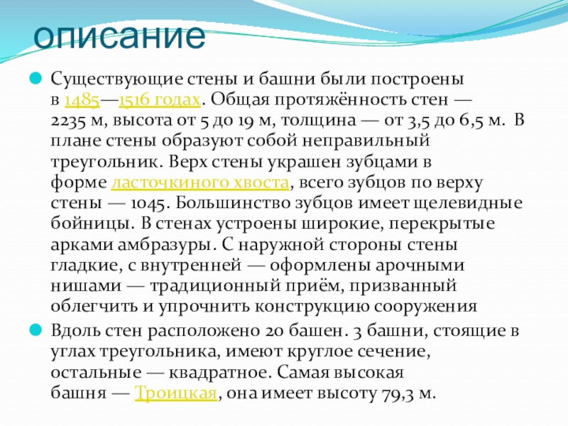 Вдоль стен расположено 20 башен. 3 башни, стоящие в углах треугольника, имеют круглое сечение, остальные — квадратное. Самая высокая башня — Троицкая, она имеет высоту 79,3 м.