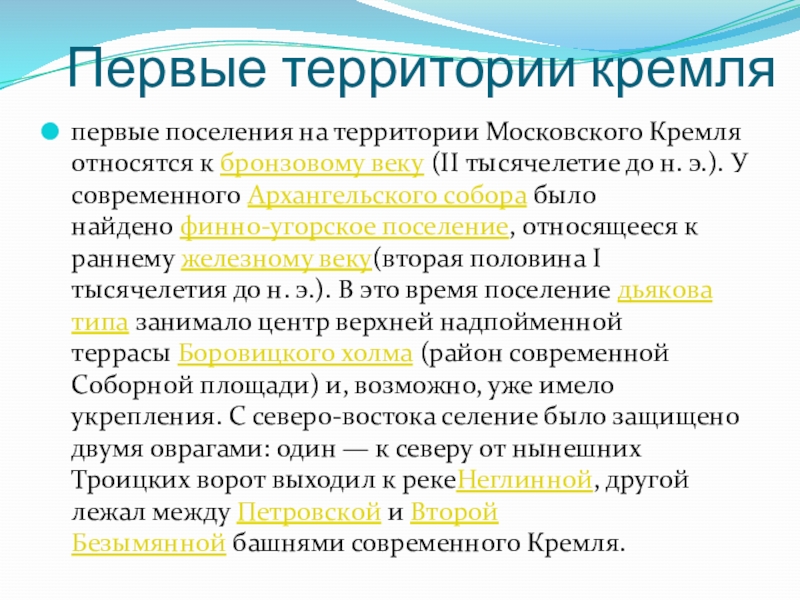 Первые территории кремля первые поселения на территории Московского Кремля относятся к бронзовому веку (II тысячелетие до н. э.). У современного Архангельского собора было