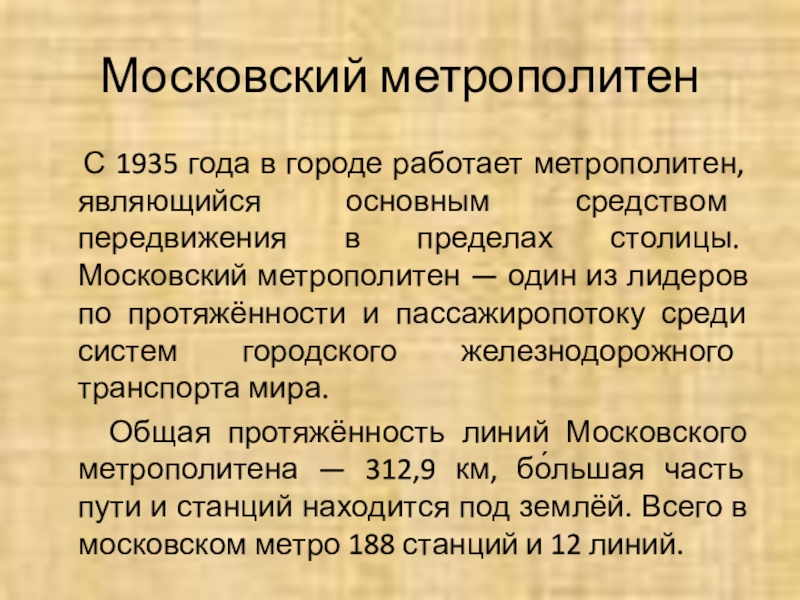 Общая протяжённость линий Московского метрополитена — 312,9 км, бо́льшая часть пути и станций находится под землёй. Всего в московском метро 188 станций и 12 линий.