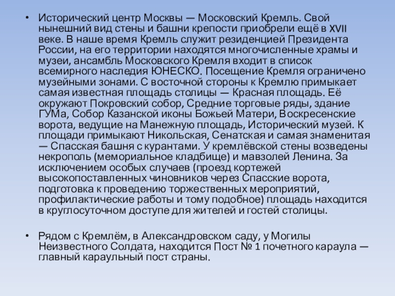 башни крепости приобрели ещё в XVII веке. В наше время Кремль служит резиденцией Президента России, на его территории находятся многочисленные храмы и музеи, ансамбль Московского Кремля входит в список всемирного наследия ЮНЕСКО. Посещение Кремля ограничено музейными зонами. С восточной стороны к Кремлю примыкает самая известная площадь столицы — Красная площадь. Её окружают Покровский собор, Средние торговые ряды, здание ГУМа, Собор Казанской иконы Божьей Матери, Воскресенские ворота, ведущие на Манежную площадь, Исторический музей. К площади примыкают Никольская, Сенатская и самая знаменитая — Спасская башня с курантами. У кремлёвской стены возведены некрополь (мемориальное кладбище) и мавзолей Ленина. За исключением особых случаев (проезд кортежей высокопоставленных чиновников через Спасские ворота, подготовка к проведению торжественных мероприятий, профилактические работы и тому подобное) площадь находится в круглосуточном доступе для жителей и гостей столицы.