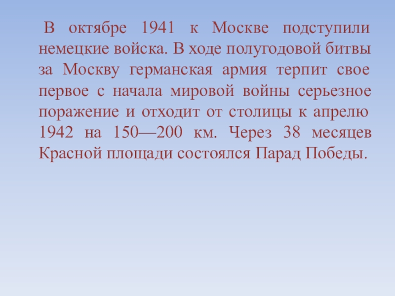 битвы за Москву германская армия терпит свое первое с начала мировой войны серьезное поражение и отходит от столицы к апрелю 1942 на 150—200 км. Через 38 месяцев Красной площади состоялся Парад Победы.