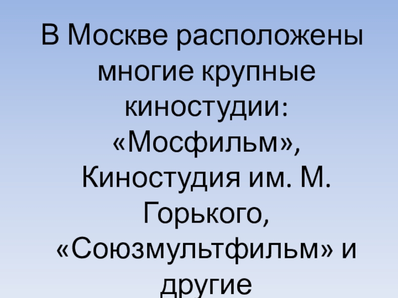 Слайд 9 В Москве расположены многие крупные киностудии: «Мосфильм», Киностудия им. М.