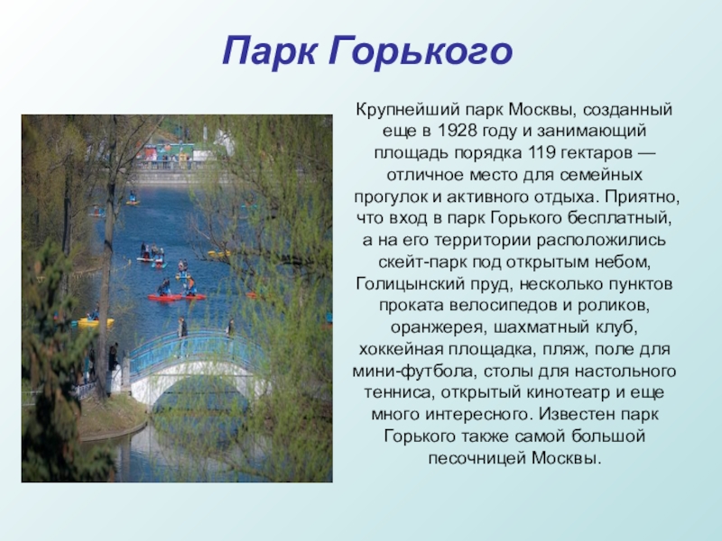 площадь порядка 119 гектаров — отличное место для семейных прогулок и активного отдыха. Приятно, что вход в парк Горького бесплатный, а на его территории расположились скейт-парк под открытым небом, Голицынский пруд, несколько пунктов проката велосипедов и роликов, оранжерея, шахматный клуб, хоккейная площадка, пляж, поле для мини-футбола, столы для настольного тенниса, открытый кинотеатр и еще много интересного. Известен парк Горького также самой большой песочницей Москвы.