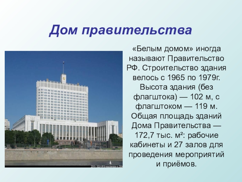1965 по 1979г. Высота здания (без флагштока) — 102 м, с флагштоком — 119 м. Общая площадь зданий Дома Правительства — 172,7 тыс. м²: рабочие кабинеты и 27 залов для проведения мероприятий и приёмов.