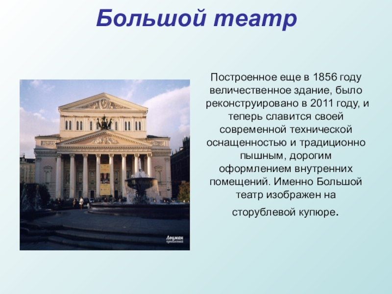 2011 году, и теперь славится своей современной технической оснащенностью и традиционно пышным, дорогим оформлением внутренних помещений. Именно Большой театр изображен на сторублевой купюре.