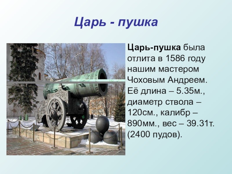 Царь-пушка была отлита в 1586 году нашим мастером Чоховым Андреем.