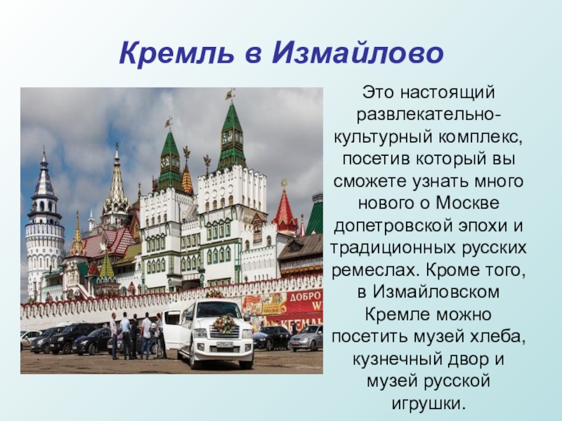 много нового о Москве допетровской эпохи и традиционных русских ремеслах. Кроме того, в Измайловском Кремле можно посетить музей хлеба, кузнечный двор и музей русской игрушки.