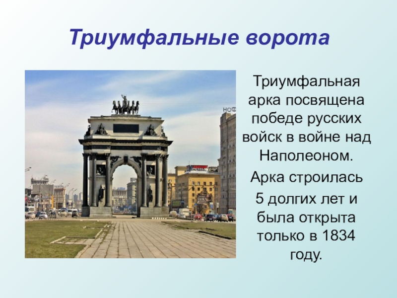 Триумфальная арка посвящена победе русских войск в войне над Наполеоном.