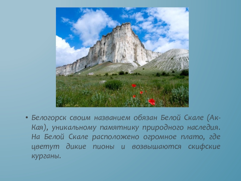 Слайд 6Белогорск своим названием обязан Белой Скале (Ак-Кая), уникальному памятнику природного наследия.