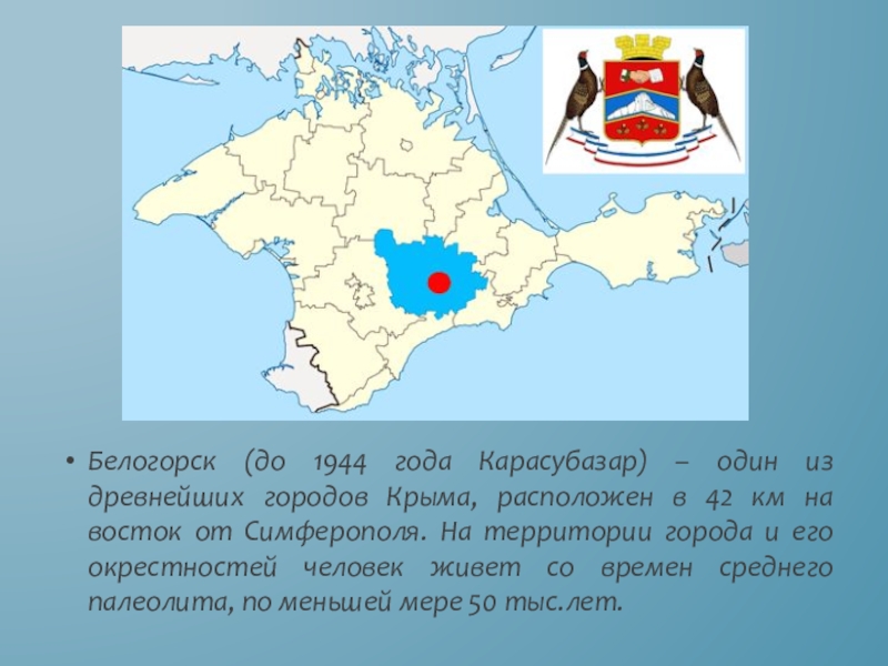 Слайд 2Белогорск (до 1944 года Карасубазар) – один из древнейших городов Крыма,